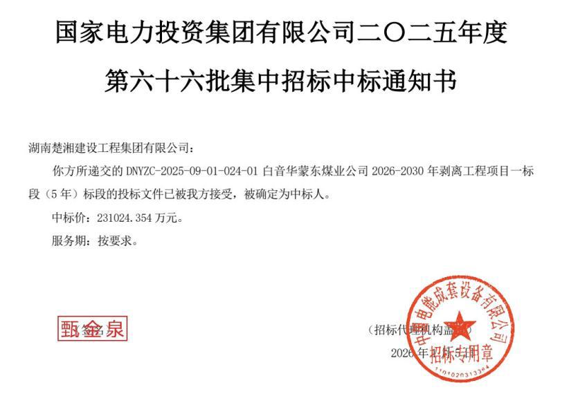 近日,一号娱乐集团所属湖南楚湘建设工程集团有限公司(以下简称“楚湘建工”)成功中标国家电投内蒙古白音华蒙东煤业公司2026—2030年剥离工程项目一标段,拿下为期5年、中标价高达23.10亿元的重磅合同,在能源建设领域的市场竞争力再攀新高,实现了从“有力竞争者”到“首选合作者”的蜕变。